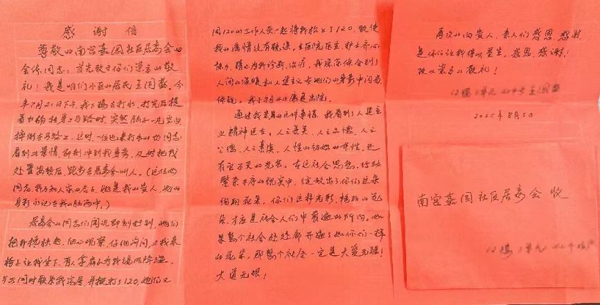 不久,家属和救护车齐赶到了现场,王国胜在家东说念主的陪护下被送往病院禁受调整。“我那天有点发热,但没当回事,没念念到这样严重,平直住了院。多亏你们实时匡助,救了我一命。”8月5日,在出院的第二天,王国胜带入辖下手写感谢信来到社区,向责任主说念主员迎面致谢。在场的韩玉婷仅仅谦卑地回复:“您吉祥无事就好,这是咱们应该作念的。”