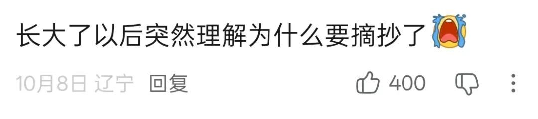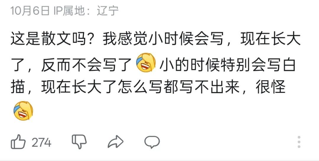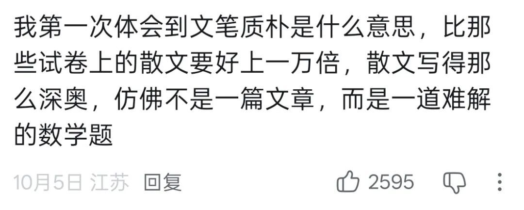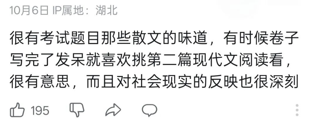 有网友在她的翰墨里,看见了语文教科书的影子。大家还主动在褒贬区给她的著作出阅读强健题,一句“抒发了作者的挂家之情”,带着成长的幽默之余,也让东说念主仿佛回到学生时期读著作的那份质朴。